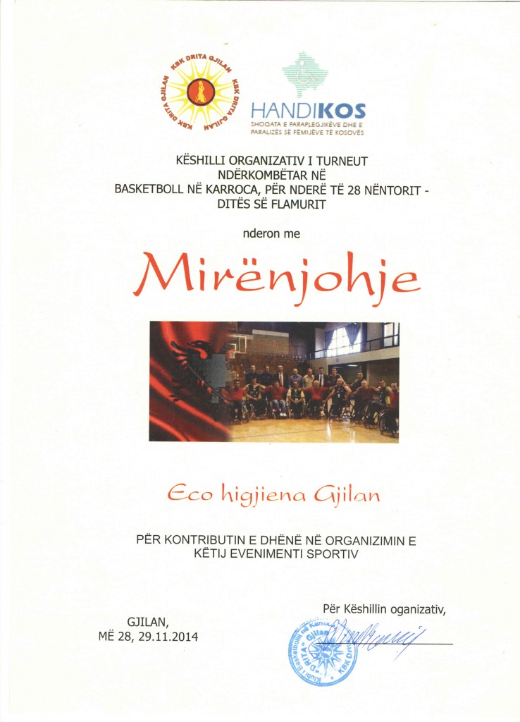 9 January 2015 News Ecohigijena is honored with a Certificate of Appreciation in honor of November 28 – Flag Day