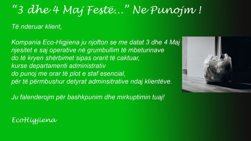 Hvala zaposlenima u EcoHigjiena Sh.p.k na njihovoj neumornoj posvećenosti i izgradnji posebnog okruženja. Naša zahvalnost je beskrajna vama i odličnoj usluzi koju pružate.