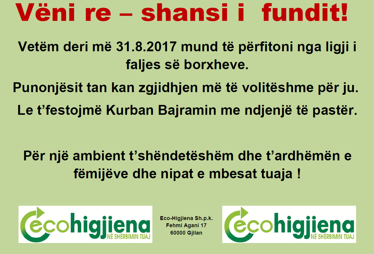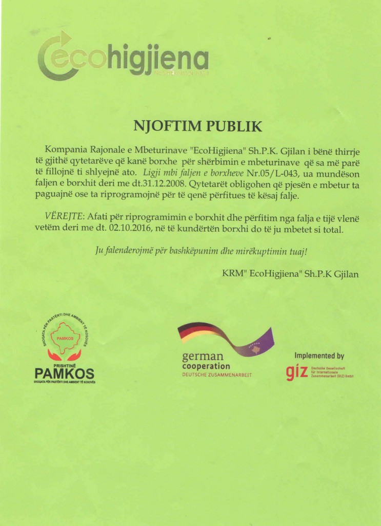 19 Maj 2017 Vesti Eco-Higjiena Sh.p.k. vam omogućava da platite račun za otpad u svim filijalama Pošte Kosova.